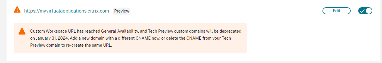 Customers may see preview alerts without a deprecation date because Citrix is in the process of including the dates in the Citrix Cloud console UI. In the upcoming Citrix Cloud release, the future release date will be included as January 31, 2024 and admins would see the updated preview alert.